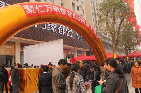 當天上午8時不到,聚仁·萬象都會臨時銷售中心門口已是人潮涌動,大批意向客戶早早就來此等候,他們當中有許多都是一家老小齊出動,顯然對此次購房非常看重。8時58分,選房活動正式開始,主持人采取搖號的方式進行開盤。每次搖出8組客戶,外圍購房者按照抽中的VIP號分批進內場進行選房,而內場選房區也是人頭攢動,頻頻傳出成交捷報。整個選房活動持續了大概3個多小時,從抽號、選房、到簽收、再到付款,開盤井然有序地進行著,大多數購房者都選到了心儀已久的房子。一位成交的客戶帶著交易合同從選房區出來時早已是滿臉笑容,她一邊急切地舉著手中的材料喊著家人過來分享,一邊打電話向之前引領她看房的置業顧問報喜,“買到了,買到了,買到了,就是我看中的那個房型,樓層也很好,太高興了!”