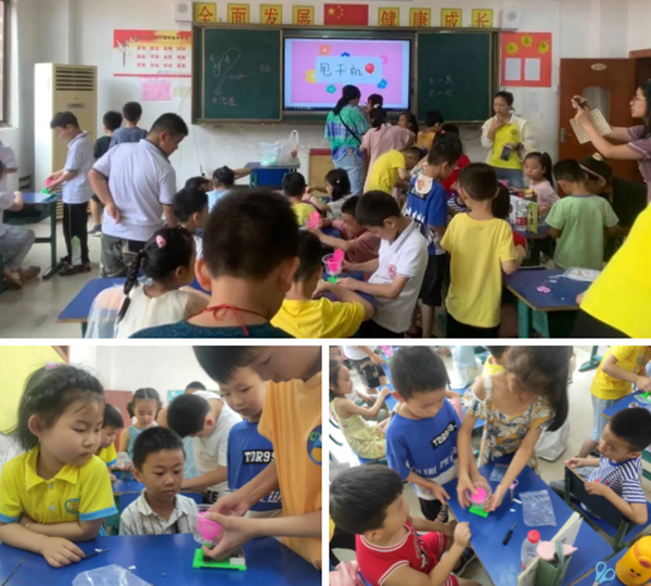 航模課上,孩子們體驗了自制“甩干機”一課。好奇的孩子們瞪大了眼睛,緊盯著哥哥姐姐們給他們講解:先把所有零件按順序拼接好,再把電線小心地纏在電流的接觸點上,然后按正負極安裝好電池……最后,小小甩干機就做好了。他們把浸過水的小布頭放進甩干機里,小心翼翼地啟動按鍵,甩干機“呼呼”地轉動起來,不一會兒小布頭就甩干了!孩子們開心地拍起手來,高喊著:“航模課真是太有趣了!”