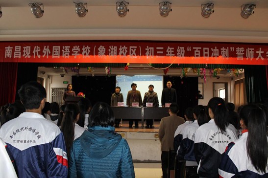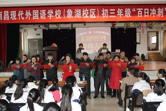 3月7日下午,南昌現代外國語學校(象湖校區)初三年級全體師生和部分家長代表共600多人,齊聚報告廳一同向中考百日宣誓。慷慨激昂的誓言,久久在象湖湖畔回蕩。