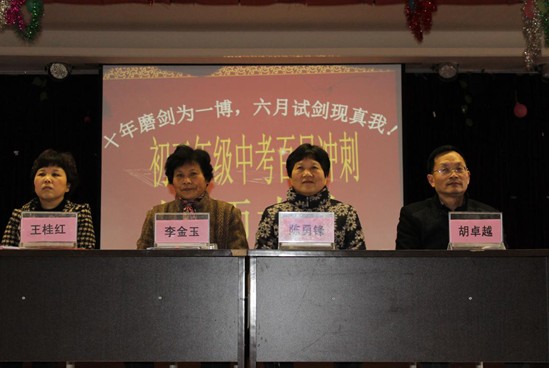 當天下午2時整,誓師大會正式開始,全體起立,奏唱國歌。伴隨著嘹亮的國歌聲響徹云霄,全體師生精神飽滿,愛國之情油然而生。隨后,學校校長李金玉發表了熱情洋溢的講話,她鼓勵初三年級全體師生再接再厲,不負學校厚望,對最后100天的教學提出了具體要求和指導性意見。緊接著,老師代表上臺發言。老師的殷切希望,諄諄教誨又有一次鼓舞了在座的全體學子。接下來,學生代表上臺發言。學生代表表示,在最后的100天里,決心集中全部精力打好基礎,科學合理分配時間,不斷調整自己的學習方法,以百倍的信心戰勝一切困難,勇奪2014年中考佳績,回報父母的養育之恩,回報恩師的教導之情,將來成為對國家有用之才。同時,會議特別安排了家長代表發言。家長代表樸實的話語充滿著對學校、孩子們的殷切希望,既有鼓勵,更飽含著期待。