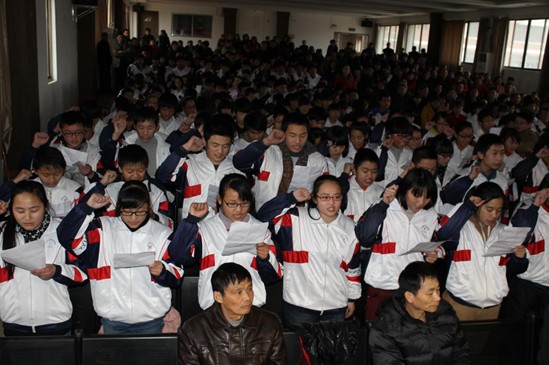 最后,師生們共同宣誓。全體初三年級組班主任和任課教師承諾,始終跟同學們在同一個“戰壕”,始終充滿激情,和同學們朝夕相處,同甘共苦,同舟共濟,竭盡全力,誓為同學們搖旗吶喊,誓為同學們保駕護航。無論成功與否,將是每一位同學的堅強后盾。在各班班長帶領下,該校初三學生也分別宣誓。師生們的誓言鏗鏘有力,響徹整個會場,充滿激情,銳不可當。他們信心百倍,誓獲2014年中考全勝!