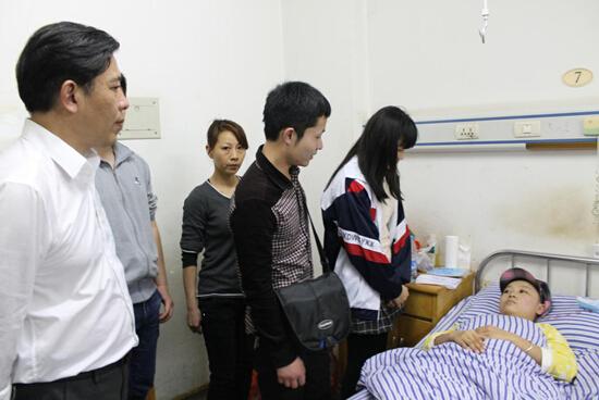 儀式過后,高中部校長朱才垂率領校教務處領導及班主任、學生代表一同前往醫院看望李玫。朱才垂鼓勵李玫要積極配合醫生治療,努力與病魔抗戰。學習的事,等病好之后學校會安排老師單獨為她輔導。