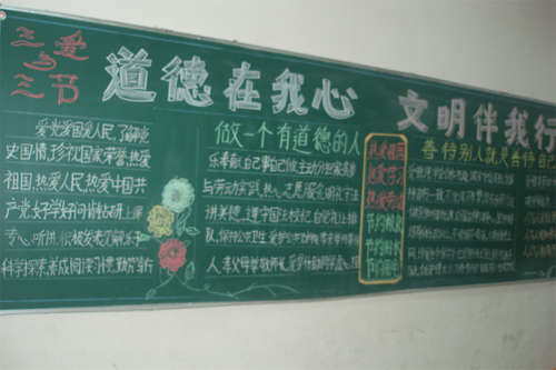 活動中,各班根據(jù)自己班級的特點,充分發(fā)揮學生的主動性,積極行動,精心設計出一塊塊主題鮮明、布局合理、形式多樣、融知識性、教育性于一體、內(nèi)容豐富的黑板報。學生以自己獨特的方式表達了對“三愛三節(jié)”的理解,讓所有同學明白“三愛三節(jié)”的真實含義。學校評委從黑板報的標題、字體、圖案、文字內(nèi)容、整體效果等項目進行了評比,評出了一、二、三等獎。