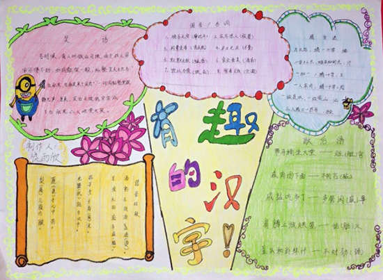 為了讓學生更好地了解漢字的起源,感受漢字的有趣和神奇,激發(fā)學生學習語文的興趣,近日,南昌現(xiàn)代外國語學校(象湖校區(qū))五年級組結合語文教材中《綜合性學習:遨游漢字王國》,開展了“有趣的漢字”手抄報比賽。