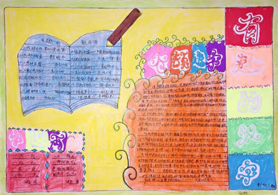 語文教材第五組《綜合性學習:遨游漢字王國》是引導學生進行綜合性學習,初步了解漢字的特點和發(fā)展歷史,加深學生對漢字和中華傳統(tǒng)文化的感情,提高正確運用漢字的自覺性。同時培養(yǎng)學生策劃和開展活動、查找和運用資料的能力。比賽前語文老師組織學生學習了有關課文,讓學生收集“有趣的漢字”各方面的知識,并通過自己靈巧的雙手,精心設計版面,創(chuàng)作出了一幅幅色彩艷麗、構思獨特、內容豐富的手抄報。本次手抄報內容涉及有趣的字謎、倉頡造字、一點值千金、諧音歇后語、諧音笑話、字的來歷等方面的知識,收到了很好的教育效果。