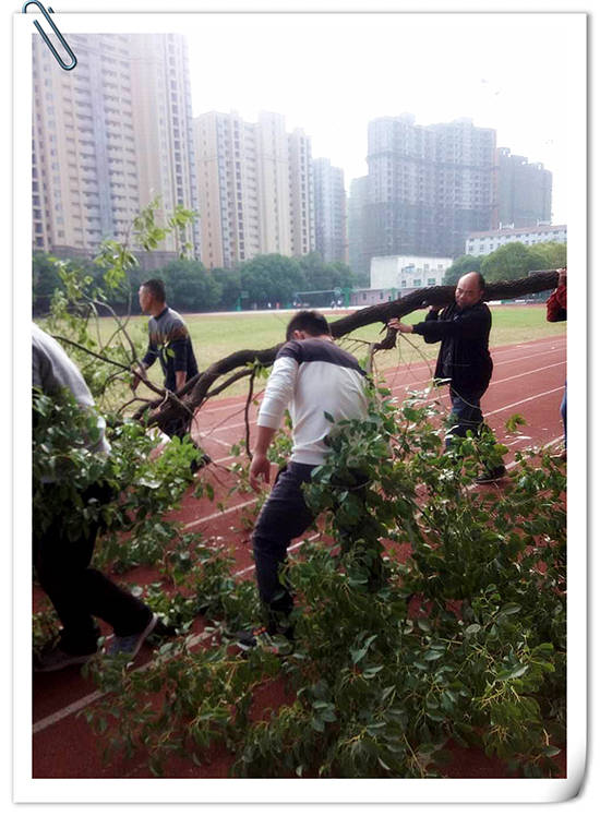 楊端煌校長接到匯報后,立即帶領學??倓战魅?、政教張主任、保衛熊科長、校醫、保安等人趕到現場。做完初步的分工后,不怕臟不怕累,親自動手據樹、抬樹。經過一個下午熱火朝天的修剪與清理,徹底消除了安全隱患,給師生們一個安全整齊的校園環境。同時,運動場也變得更加寬敞明亮了。
