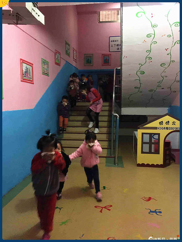 隨著消防報警聲的響起,各班教師依據疏散路線快速、有序地帶領幼兒用濕毛巾捂住口鼻、貓著腰,快步下樓疏散到了操場,整個演練活動做到快速、安全、有序。