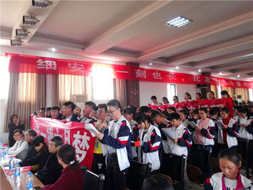 隨后,初三教師代表程興國老師作了一場(chǎng)熱情洋溢的沖刺動(dòng)員講話,“為了大家能夠更加出類拔萃;為了大家能夠成為祖國的棟梁之才。我們傾其所有,助你們揚(yáng)帆遠(yuǎn)航,你們舉胸中豪情,與雷霆碰杯,傾熱血滿腔,同日月爭(zhēng)光。”那一句句鏗鏘有力、震撼人心的聲音賦予現(xiàn)場(chǎng)每個(gè)人奮進(jìn)的信心與勇氣。話音剛落,初三全體教師個(gè)個(gè)斗志昂揚(yáng),在主席臺(tái)大聲宣誓,我們一定做你們的堅(jiān)強(qiáng)后盾,為你們領(lǐng)航。請(qǐng)同學(xué)們以百倍的信心,銳不可當(dāng)?shù)臍鈩?shì)來面對(duì)著一百天。接著學(xué)生代表萬新晨同學(xué)代表全體畢業(yè)生承諾:我們將以飽滿的情緒、昂揚(yáng)的斗志,調(diào)動(dòng)起全部的智慧,凝聚起全部的熱情,全身心地備戰(zhàn)中考。以優(yōu)異的成績,給母校一個(gè)奇跡,給老師一個(gè)驚喜,給家長一個(gè)安慰!李亞萱同學(xué)的母親發(fā)言更是讓我們感受到了社會(huì)對(duì)我們學(xué)校工作的支持與認(rèn)可。