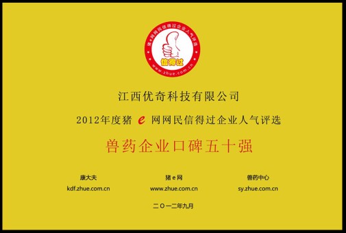 近日,由中國豬e網舉辦的“中國信得過獸藥企業人氣評選活動”順利落幕,在網友投票下,江西優奇(動保)科技有限公司票數位列前茅,經投票最后優奇(動保)科技榮獲“2012年度信得過獸藥企業50強”。