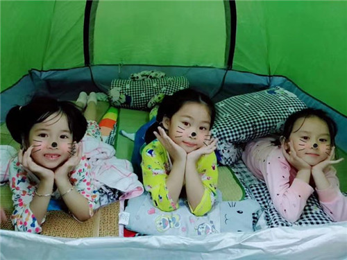 當晚,小朋友都穿上了各自的睡衣來幼兒園,舉行了一場睡衣趴活動,孩子們穿著五顏六色的睡衣上演“睡衣走秀”,大家開心地都合不攏嘴。晚上八點準時在各班觀看老師給幼兒們準備的電影,讓孩子在幼兒園里也體驗到了電影院里的氣氛。活動后,孩子們還品嘗到了甜甜蜜蜜的點心和水果。最后,所有活動結束后,孩子們在老師的指導下,紛紛搭好了自己的小帳篷,紛紛洗漱完后,都走進一個個小帳篷進入了夢鄉。
