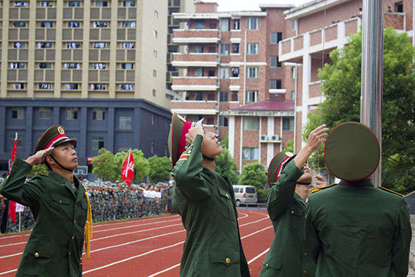 伴隨著莊嚴的國歌聲,五星紅旗冉冉升起,在操場上空迎風飄揚。隨后是全校軍訓新生分批進行隊列匯報表演,統一的迷彩裝,整齊的步伐,體現了工商新生在新學期飽滿的熱情和積極的態度。院長劉明初走到學生方隊中進行檢閱。一句句嘹亮的口號聲響徹云霄,一組組方陣從主席臺前經過,同學們個個精神飽滿,軍姿挺拔,在教官的帶領下邁著整齊的步伐昂向前,出色的表現不時贏得現場領導和老師的陣陣掌聲。