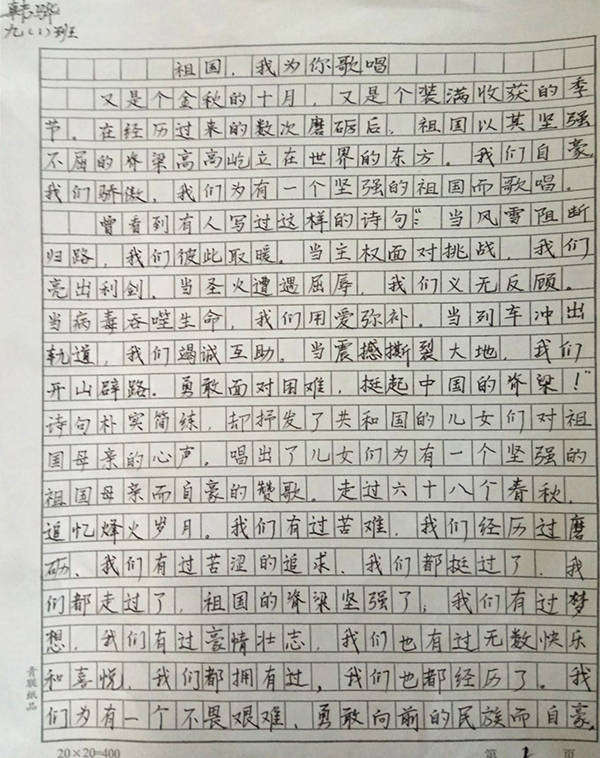 今年是偉大的祖國成立68周年,為了更好地弘揚愛國主義,也為了檢測中學生的習作能力,南昌現(xiàn)代外國語學校(迎賓校區(qū))初中部組織了以“愛我中國”為主題的國慶征文比賽。