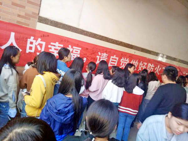 2017年11月9日是全國第27個“119消防日”,學院舉行了“119消防宣傳日”千人簽名活動,保衛處在北一棟教學樓處設一條十一米的簽名活動橫幅,橫幅的內容是:“為了你和他人的幸福,請自覺做好防火工作。