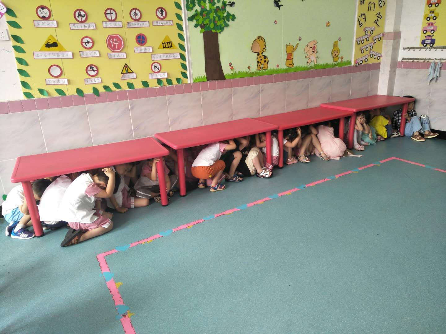 下午3時,演練程序啟動,隨著演練信號響起,防震疏散演練正式開始。各班老師立即告知幼兒“地震來了,不要慌”,并指揮幼兒緊急避險(指導幼兒迅速抱頭、閉眼,躲在桌下,盡量蜷曲身體,降低身體重心,并盡可能保護頭部)。