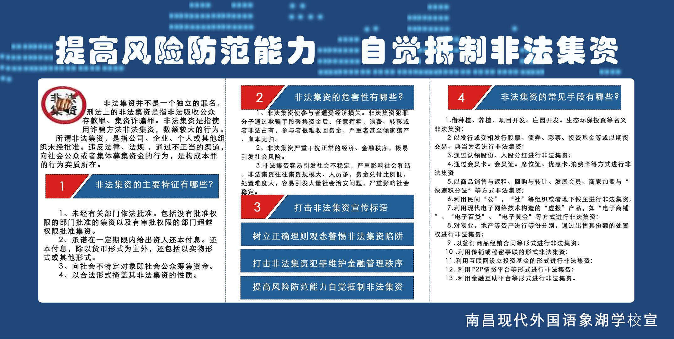 根據《南昌市2018年防范和打擊非法集資宣傳月活動實施方案》要求,以保護人民群眾切身利益、維護社會穩定為出發點,提高社會公眾對非法集資的識別能力,教育人民群眾增強風險防范意識,培養正確的投資理念,營造防范打擊非法集資的良好輿論氛圍,震懾犯罪分子,并以此擴大宣傳教育覆蓋面,增強宣傳效果,我校特開展防范和打擊非法集資宣傳教育進校園活動。