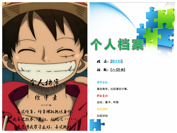 此次參賽作品的文字內(nèi)容包含四方面:一、基本信息;二、學(xué)科介紹;三、興趣愛好;四、自我評(píng)價(jià)。同學(xué)們以自己為主,發(fā)揮想象,根據(jù)自己的興趣愛好,自由創(chuàng)作。